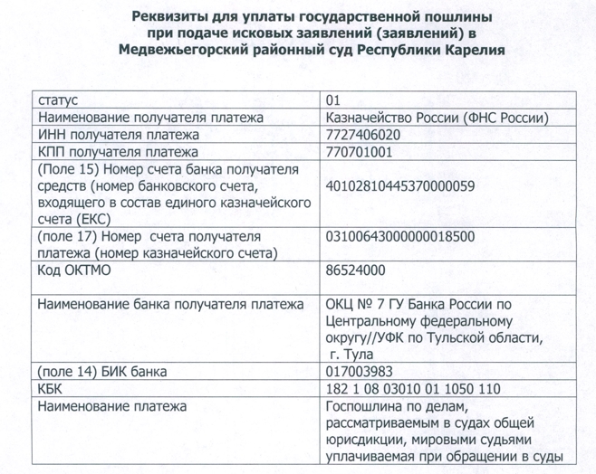 - КБК 18210803010011050110 «Государственная пошлина по делам, рассматриваемым в судах общей юрисдикции, мировыми судьями (за исключением Верховного Суда Российской Федерации) (государственная пошлина, уплачиваемая при обращении в суды)»;